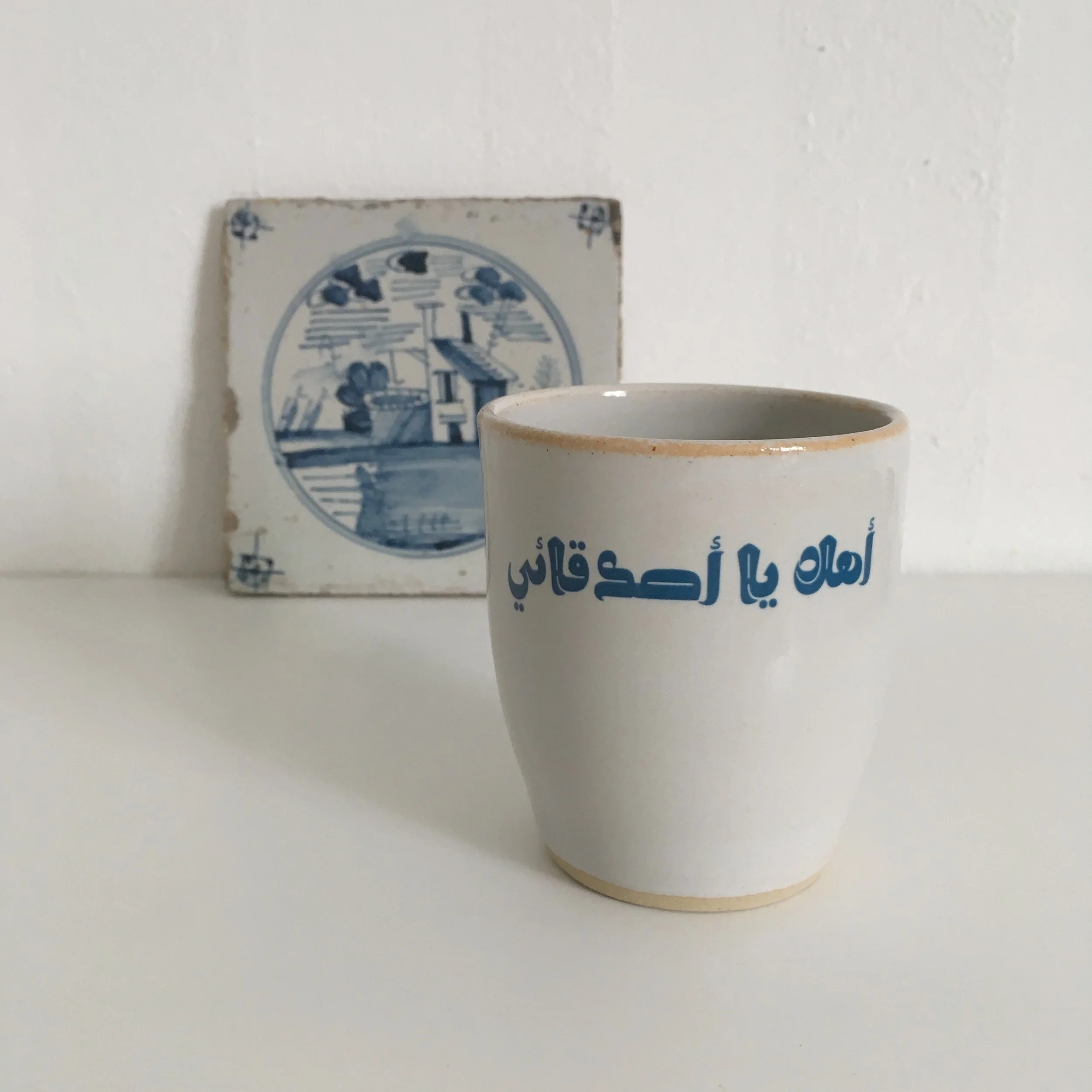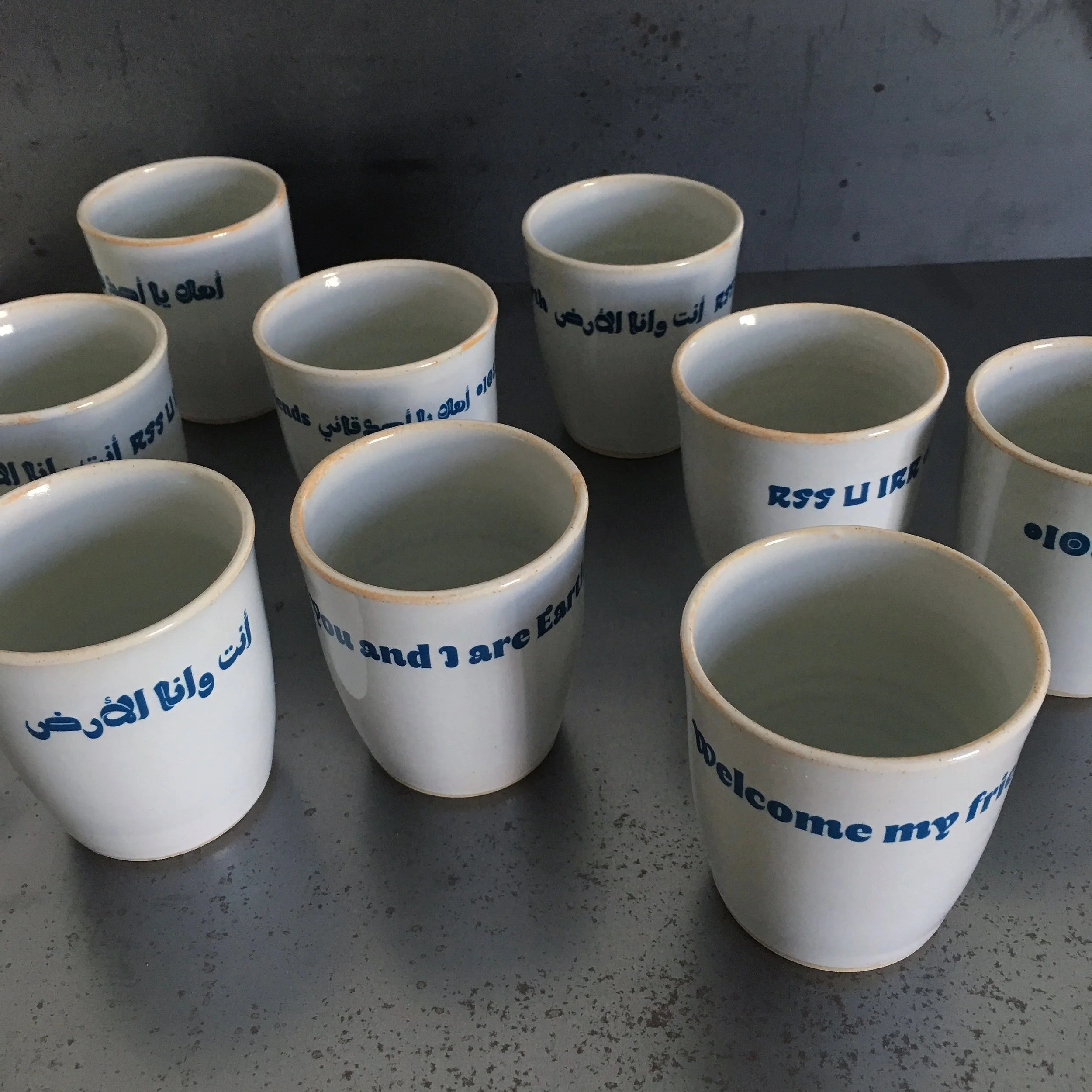 These are the first cups we made, to experiment with what size font would be best and decide on the colour of blue we will use for the transfers.